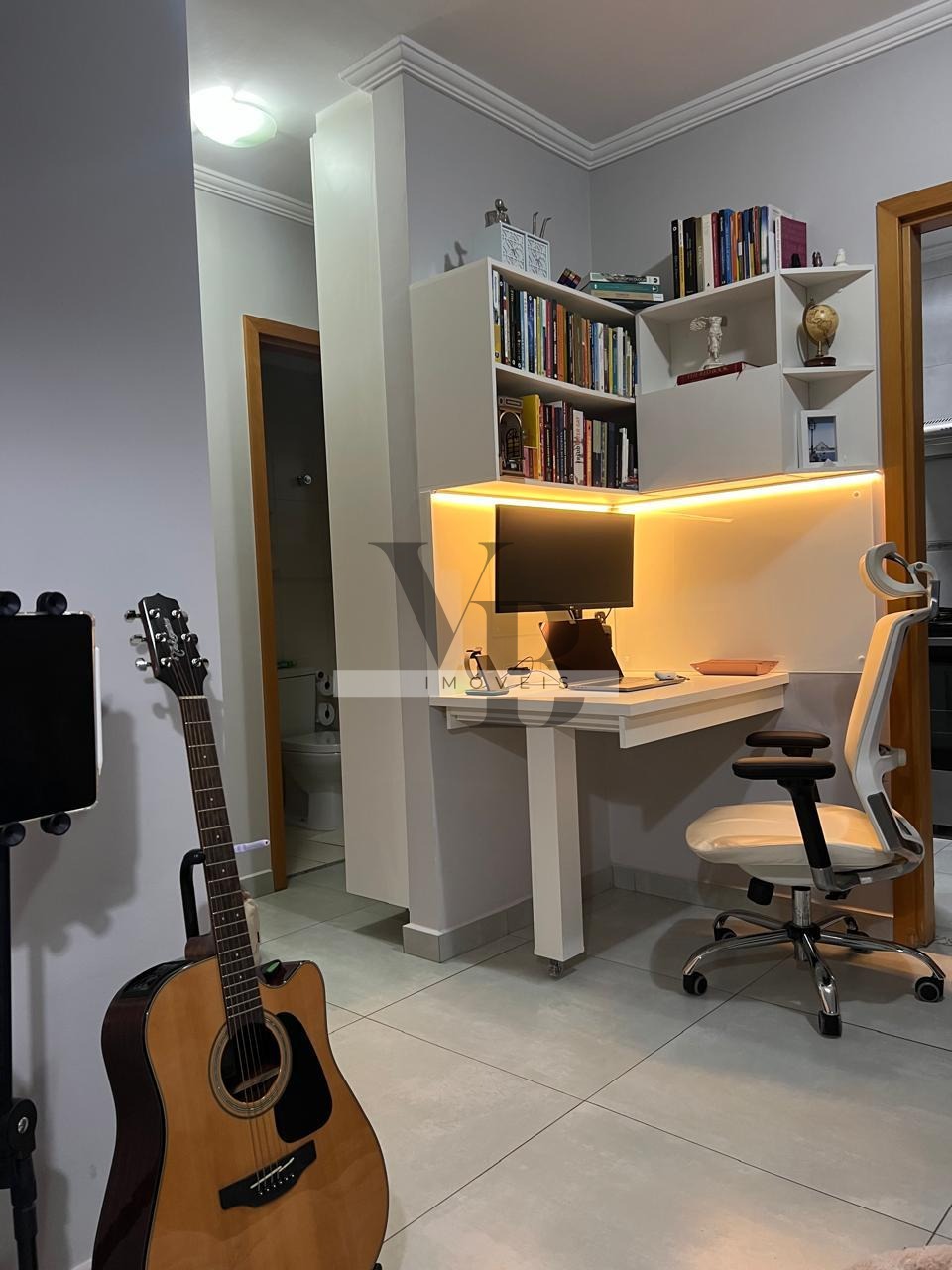 Home office incrível, com mesa expansível, quadro branco de vidro e iluminação em LED – perfeito para produtividade e conforto.
