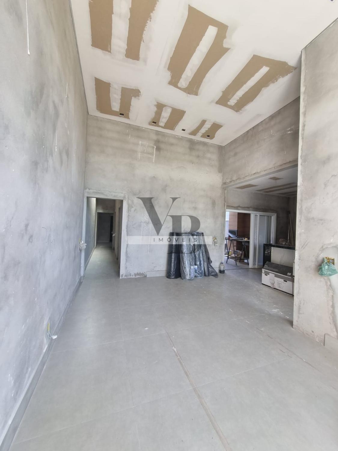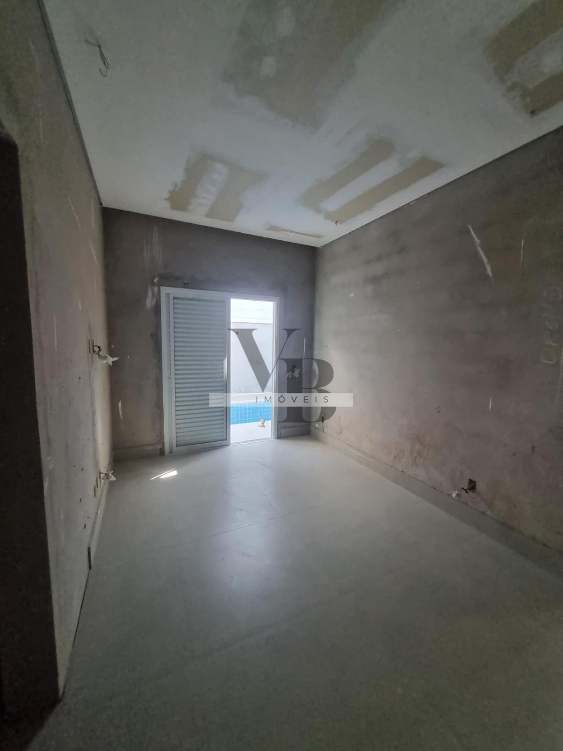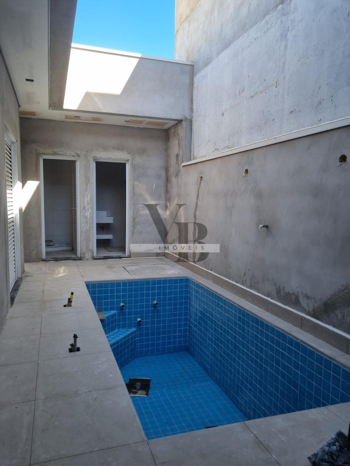Casa térrea em construção com 3 dormitórios, sendo 1 suíte com amplo closet e acesso ao quintal com piscina. Living para 2 ambientes, cozinha americana com despensa, escritório e banheiro social. Área de serviço separada e banheiro externo na área da piscina. Acabamento de alto padrão com materiais premium.