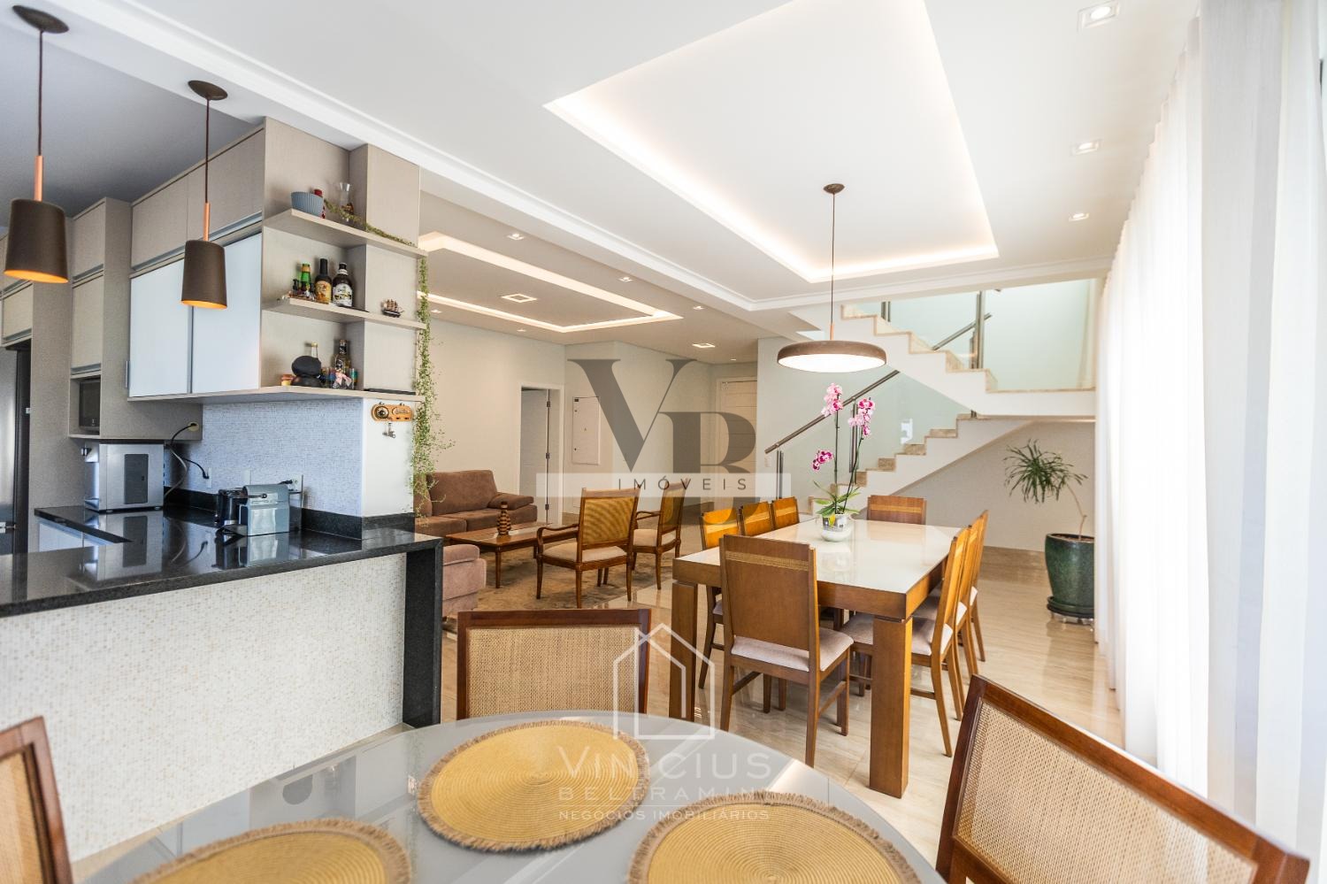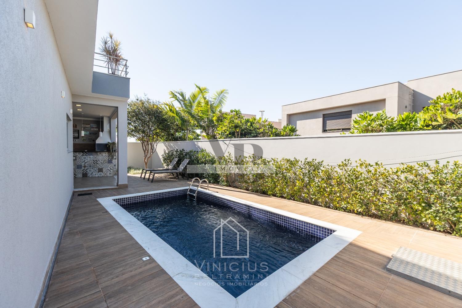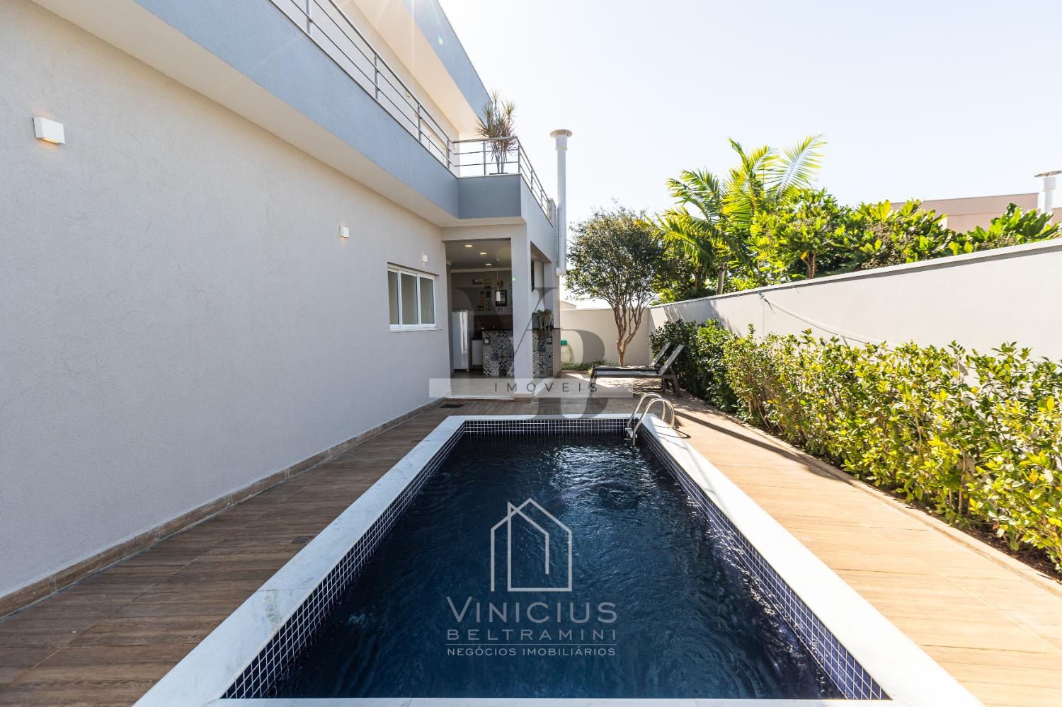A cozinha americana, moderna e prática, se conecta à área social e ao espaço gourmet completo, ideal para quem adora receber. A piscina completa o lazer privativo, criando o cenário perfeito para momentos de relaxamento e diversão.