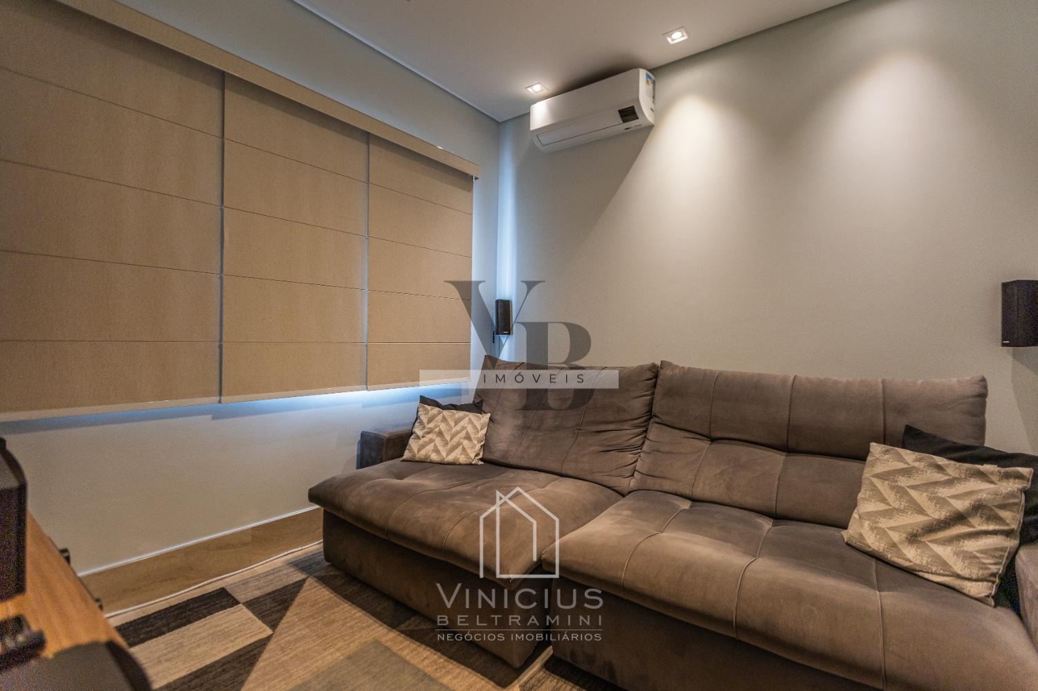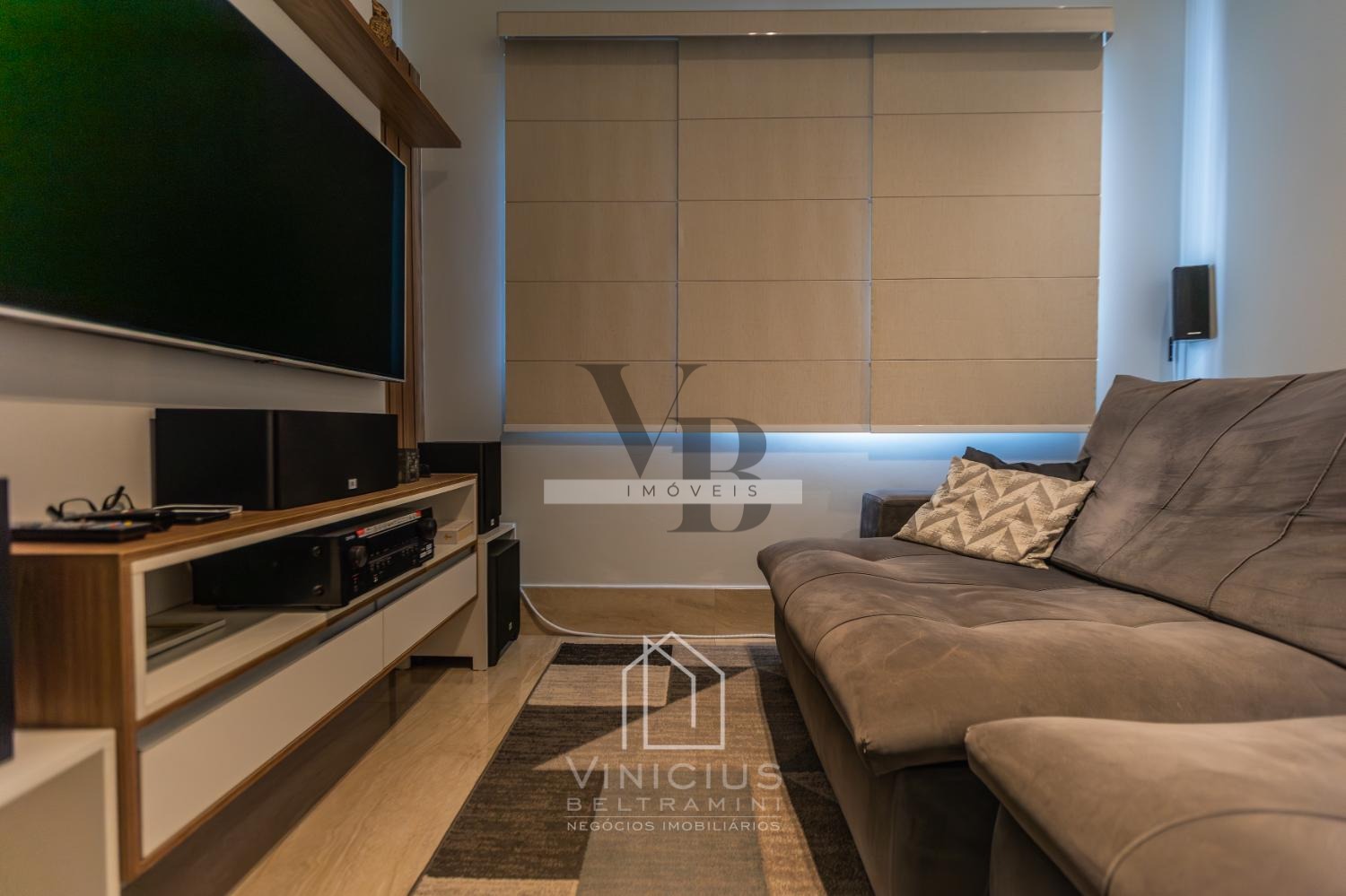 O living para 3 ambientes integra sofisticação e amplitude, com ambientes bem iluminados e ventilados, além de um confortável home theater, ideal para aproveitar momentos em família.