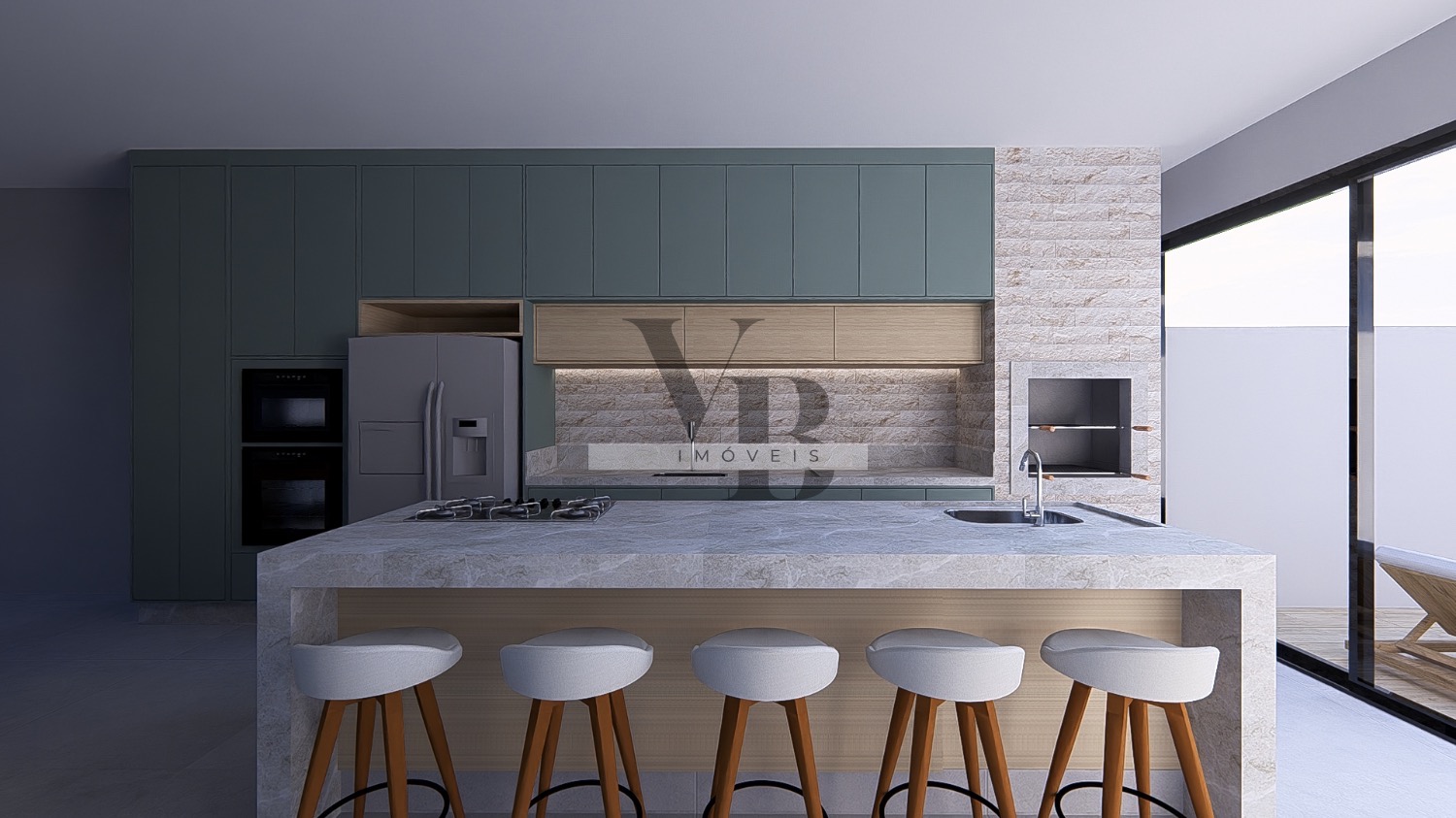 • Cozinha planejada com móveis sob medida, integrada à área gourmet