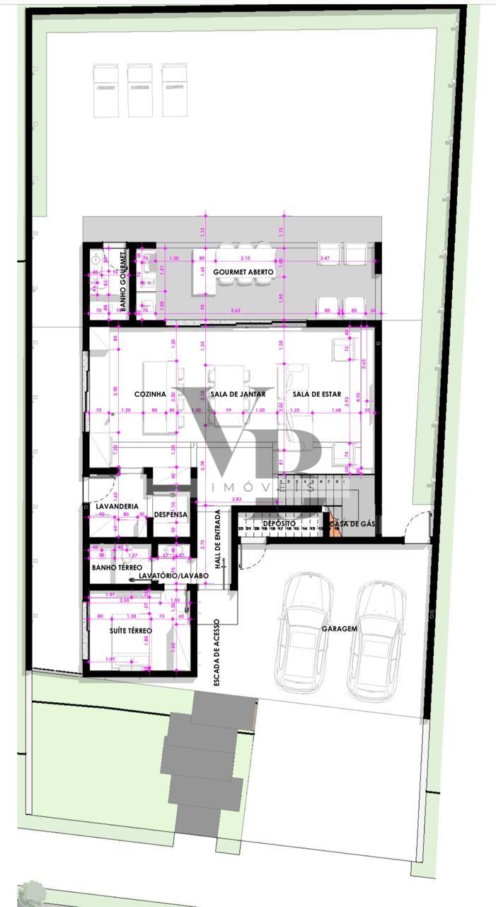 1o pavimento: Living amplo com cozinha americana, quarto reversível p/ suíte no térreo, espaço gourmet c/ churrasqueira americana e banheiro, lavanderia c/ despensa, depósito na garagem, depósito para gás, 4 vagas garagem.
