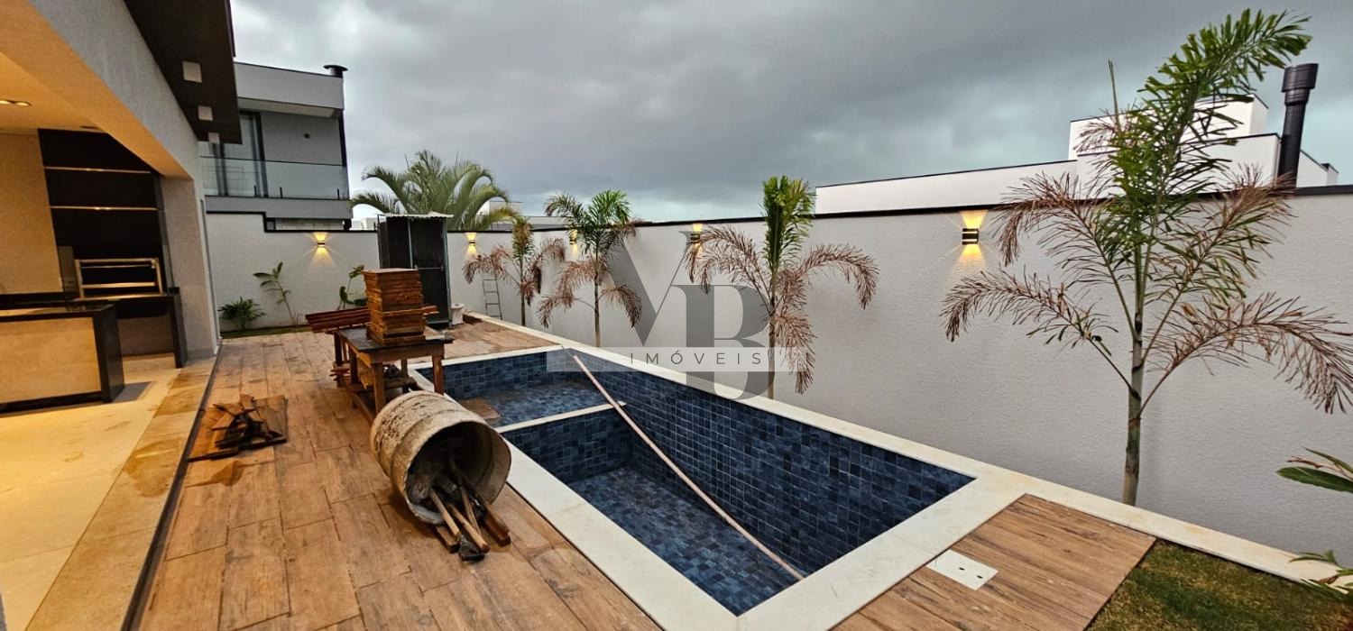 Lindo Sobrado Alto Padrão com 420 m² do terreno. Piso superior com 3 suítes, sendo a master com closet e banheira de imersão, mezanino amplo (ideal para escritório ou sala íntima). piso térreo com ambientes integrados sala de estar, sala de TV, sala de jantar e cozinha americana. suíte térrea lavabo, despensa, lavanderia, depósito e banheiro externo, área gourmet com piscina. Energia solar, aquecimento solar da piscina, infraestrutura para ar-condicionado em todos os ambientes, persianas elétricas nas suítes, telhado com telhas térmicas sanduíche, reservatório para 3.000 litros de água, escada interna com acesso à torre da caixa d’água.
