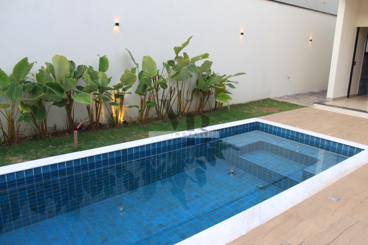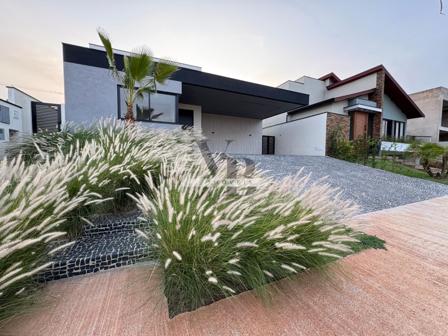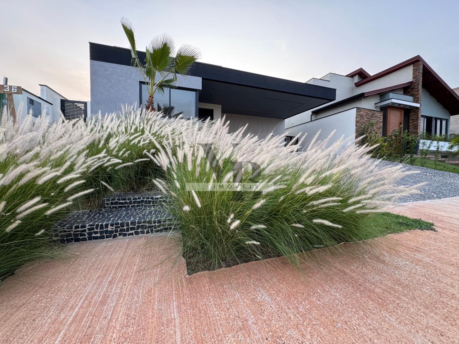 O destaque fica para o lazer completo, com piscina com hidromassagem para 4 pessoas, cascata, prainha para espreguiçadeiras e uma área verde exuberante — o piso externo é drenante e intercalado com vegetação, reforçando a conexão com a natureza.