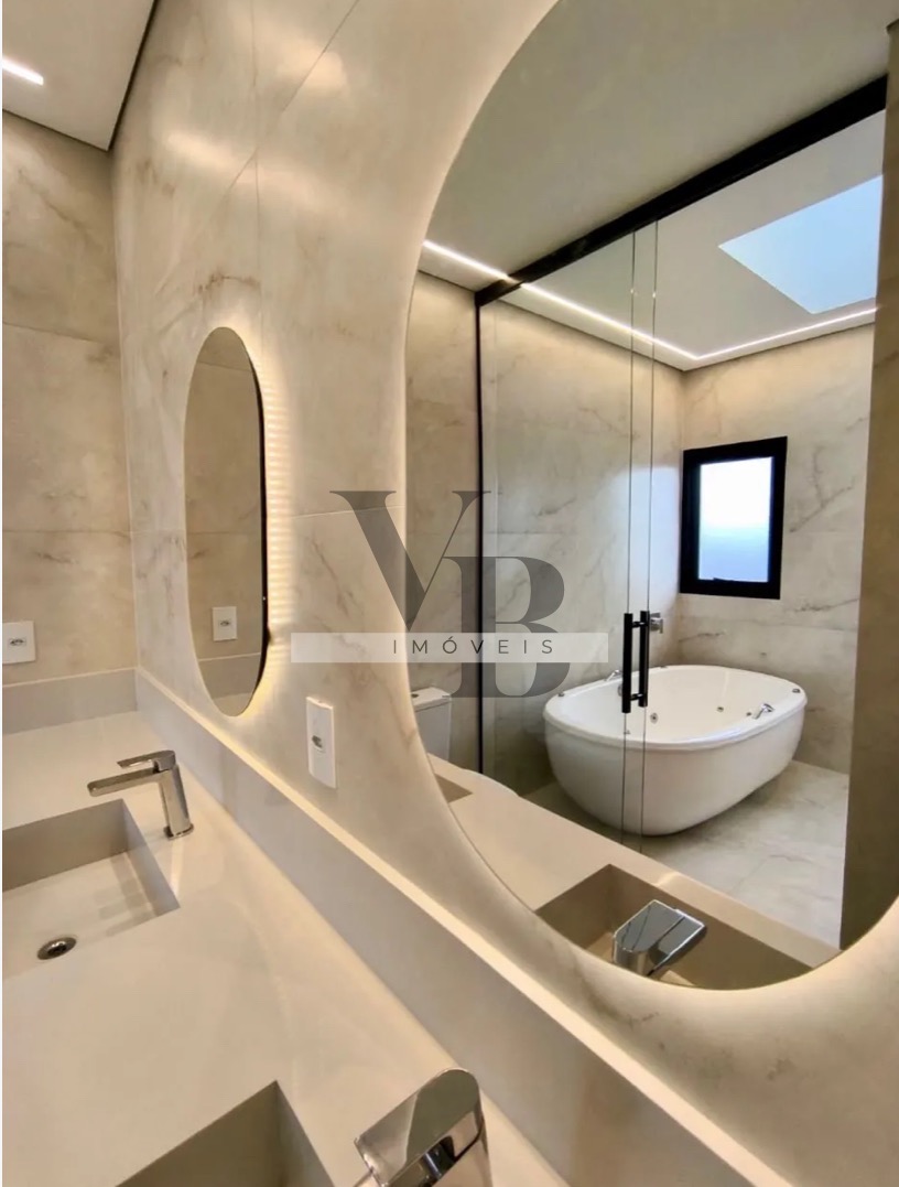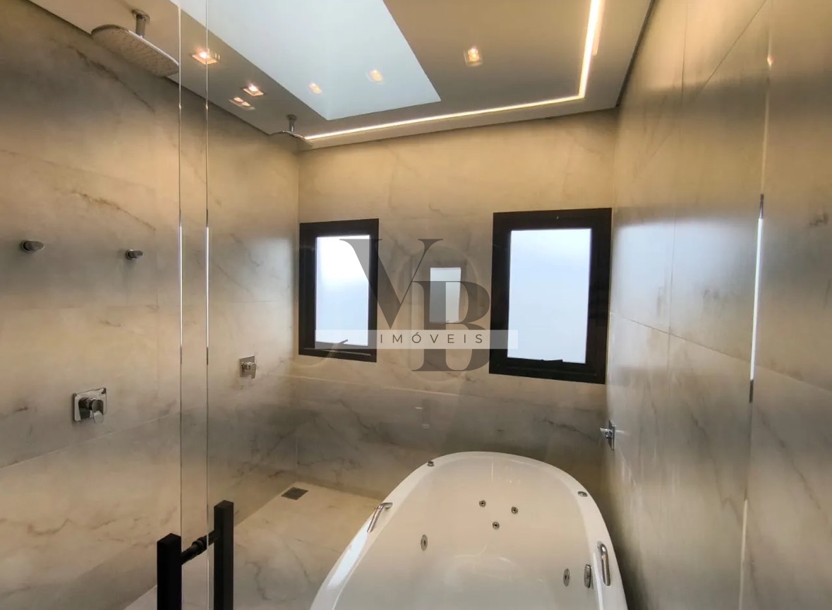 Suíte master com closet, varanda privativa e banheiro tipo spa, com banheira dupla, dois chuveiros de teto e claraboia natural.