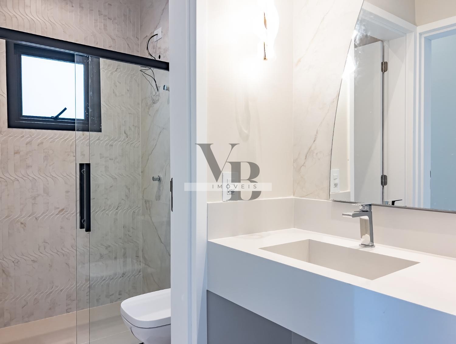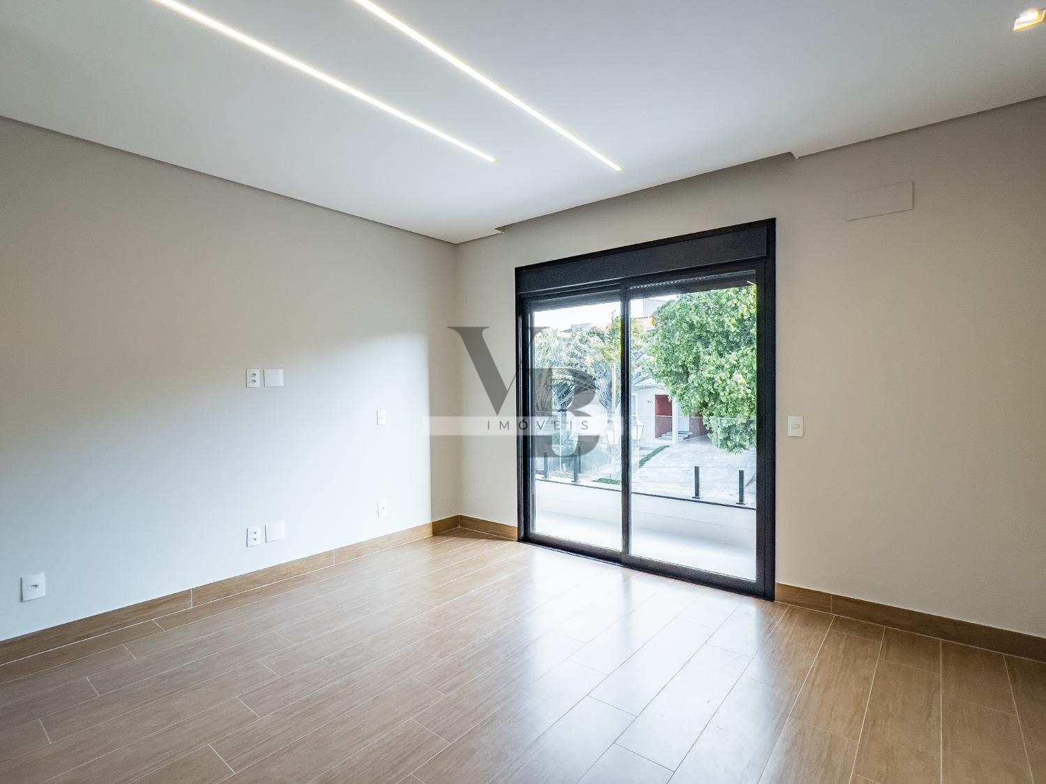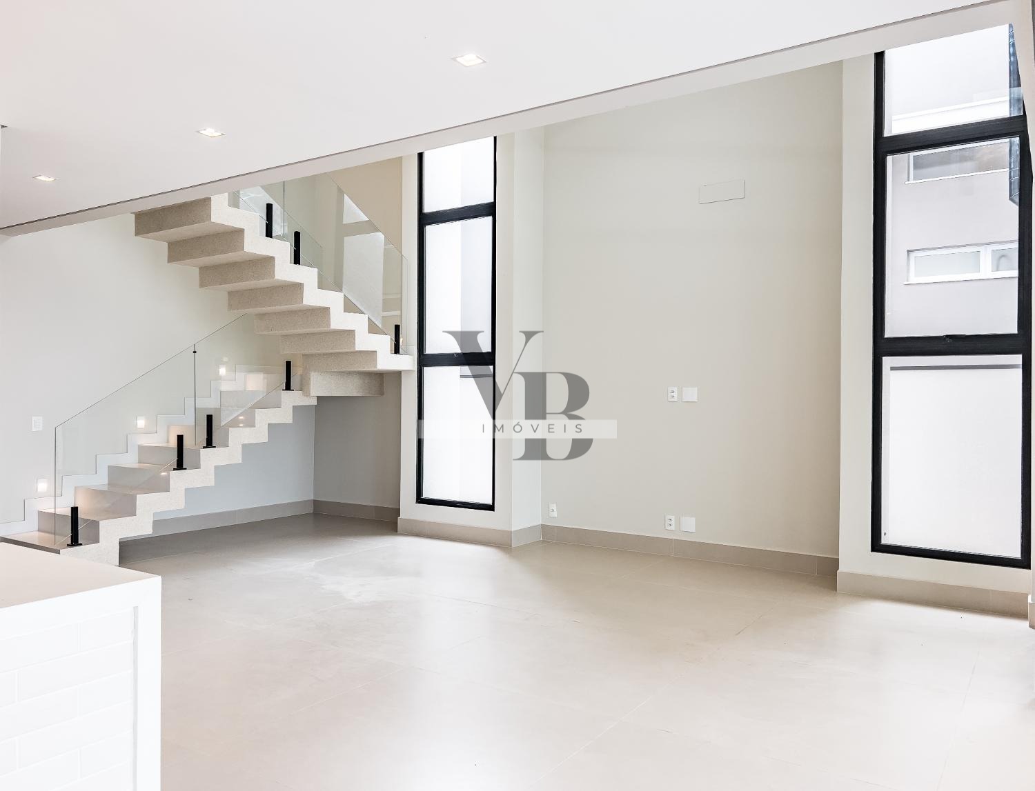 Projeto sofisticado e funcional com 3 suítes no piso superior, todas com varanda e persianas automatizadas, além de 1 cômodo multiuso no térreo (reversível para 4ª suíte ou escritório).