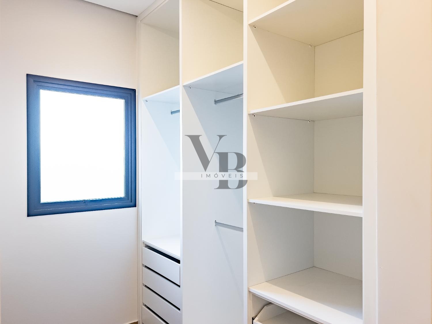 Suíte master com closet, varanda privativa e banheiro tipo spa, com banheira dupla, dois chuveiros de teto e claraboia natural.