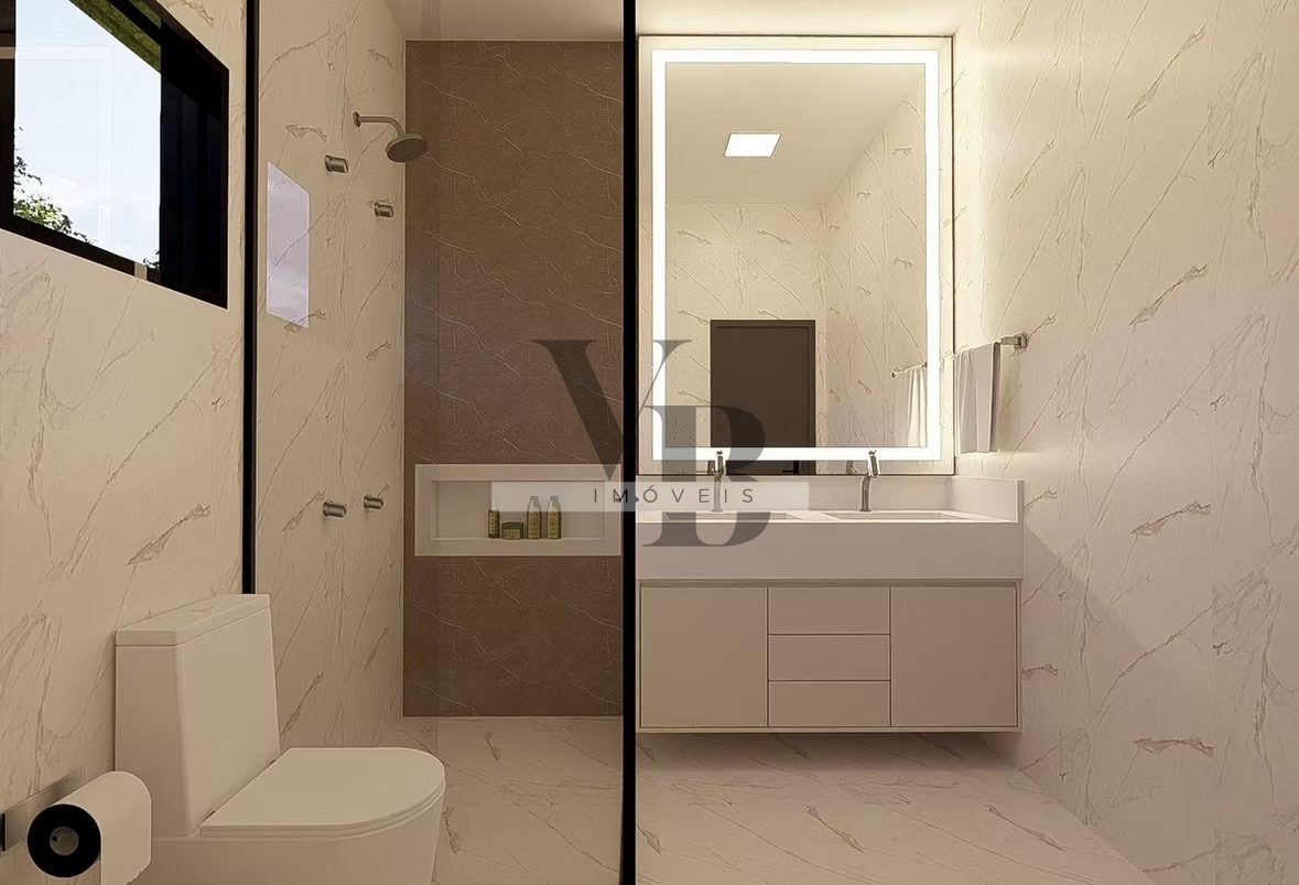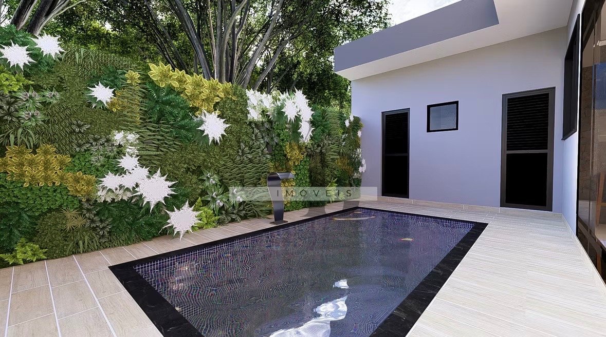 A casa dispõe de piscina e banheiro externo para maior comodidade em momentos de lazer. O acabamento inclui metais e louças das marcas Deca ou Celite, além de box e espelhos até o teto, garantindo elegância e durabilidade. Possui sistema de aquecimento solar, área de serviço funcional e garagem para dois carros.