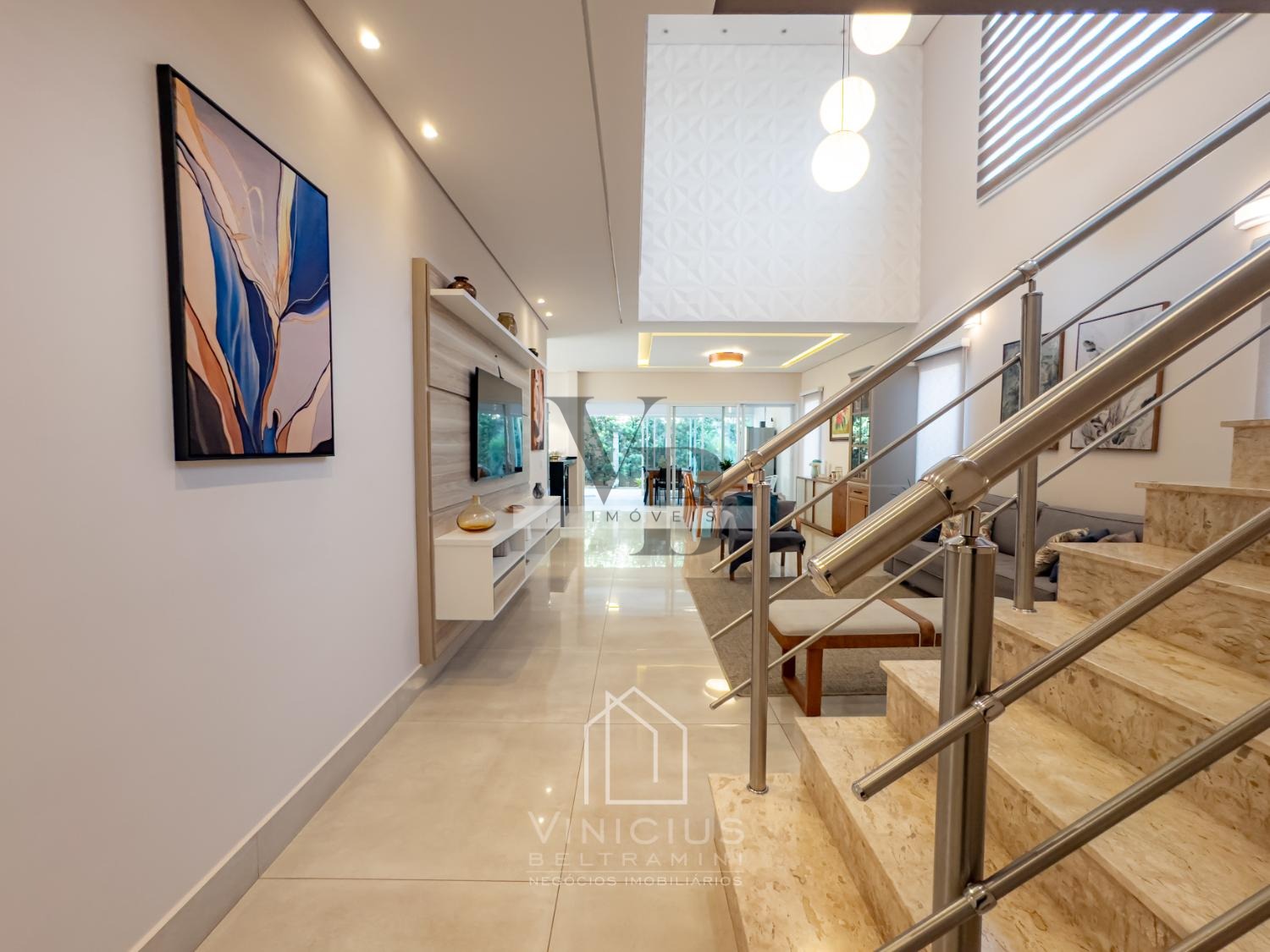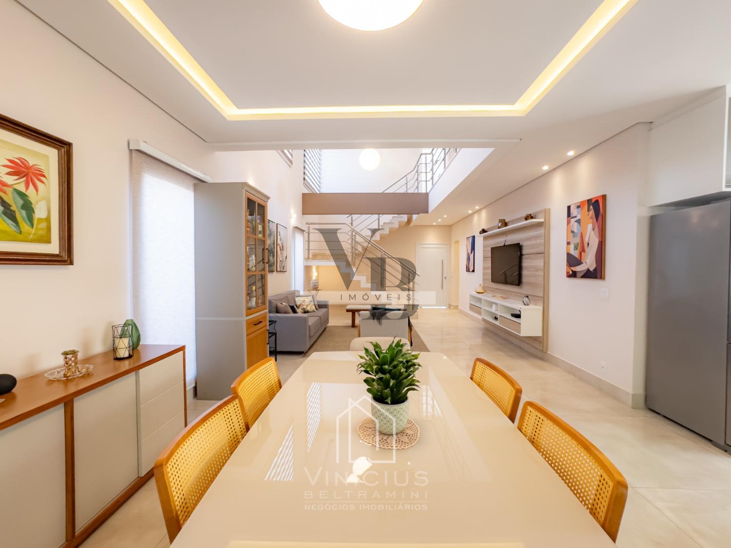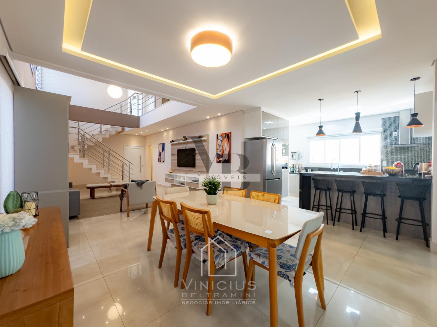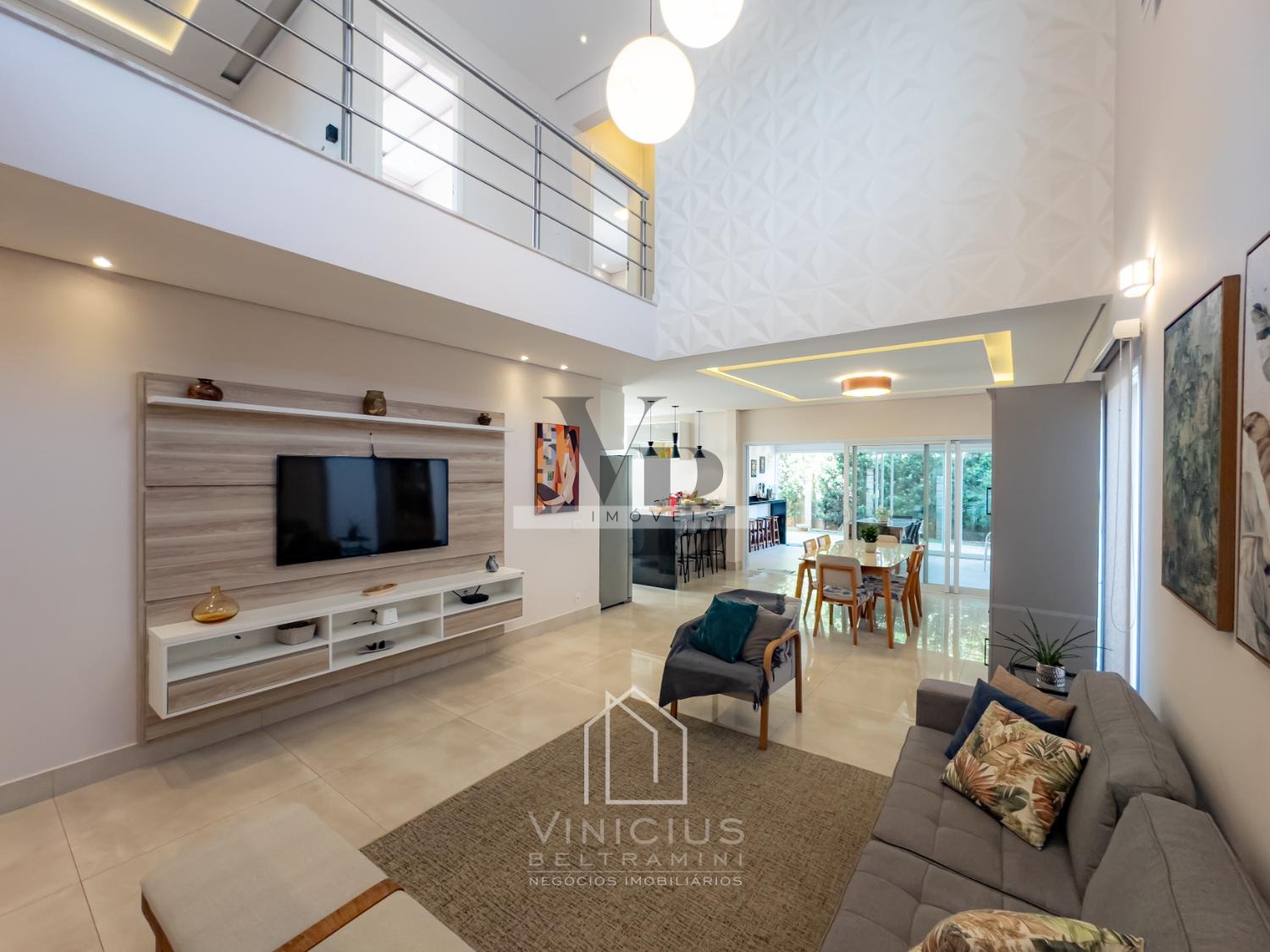 No pavimento térreo, o imóvel conta com pé-direito duplo e amplo living integrado, proporcionando ambientes espaçosos e iluminados. Possui lavabo, cozinha americana equipada com ilha, cooktop, forno e coifa, além de um espaço gourmet envidraçado, integrado à cozinha e com banheiro de apoio. Dispõe ainda de despensa, lavanderia, quintal com paisagismo e acesso lateral independente. Garagem com capacidade para 6 veículos, sendo 4 vagas cobertas e 2 descobertas.