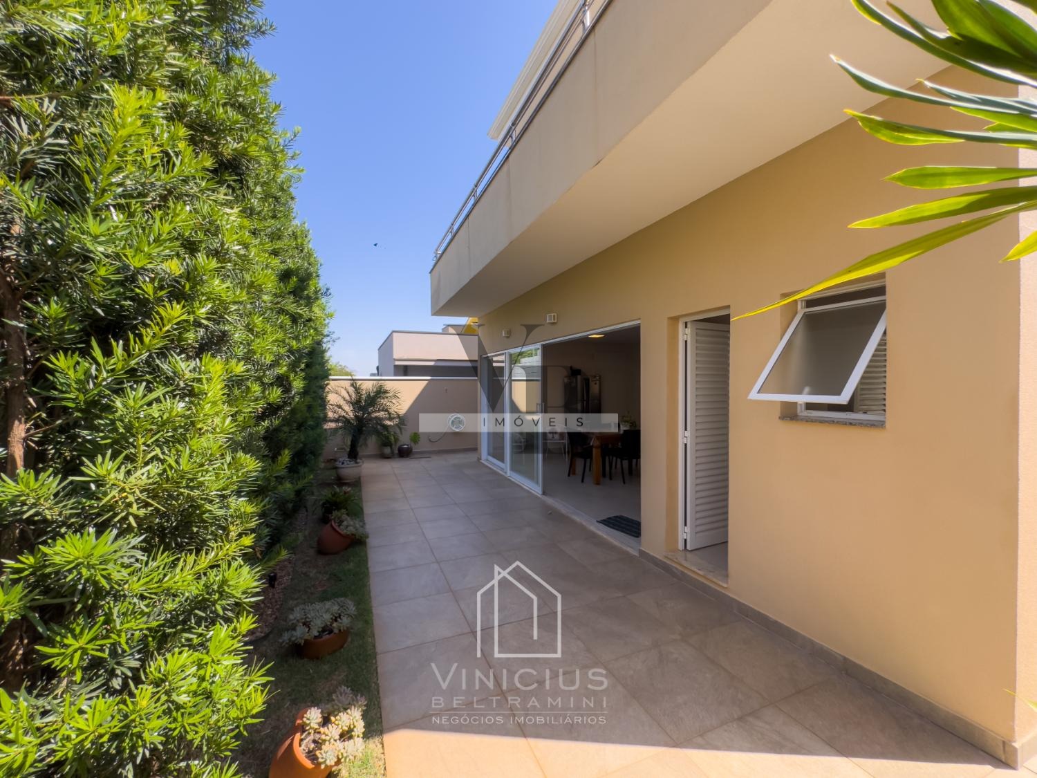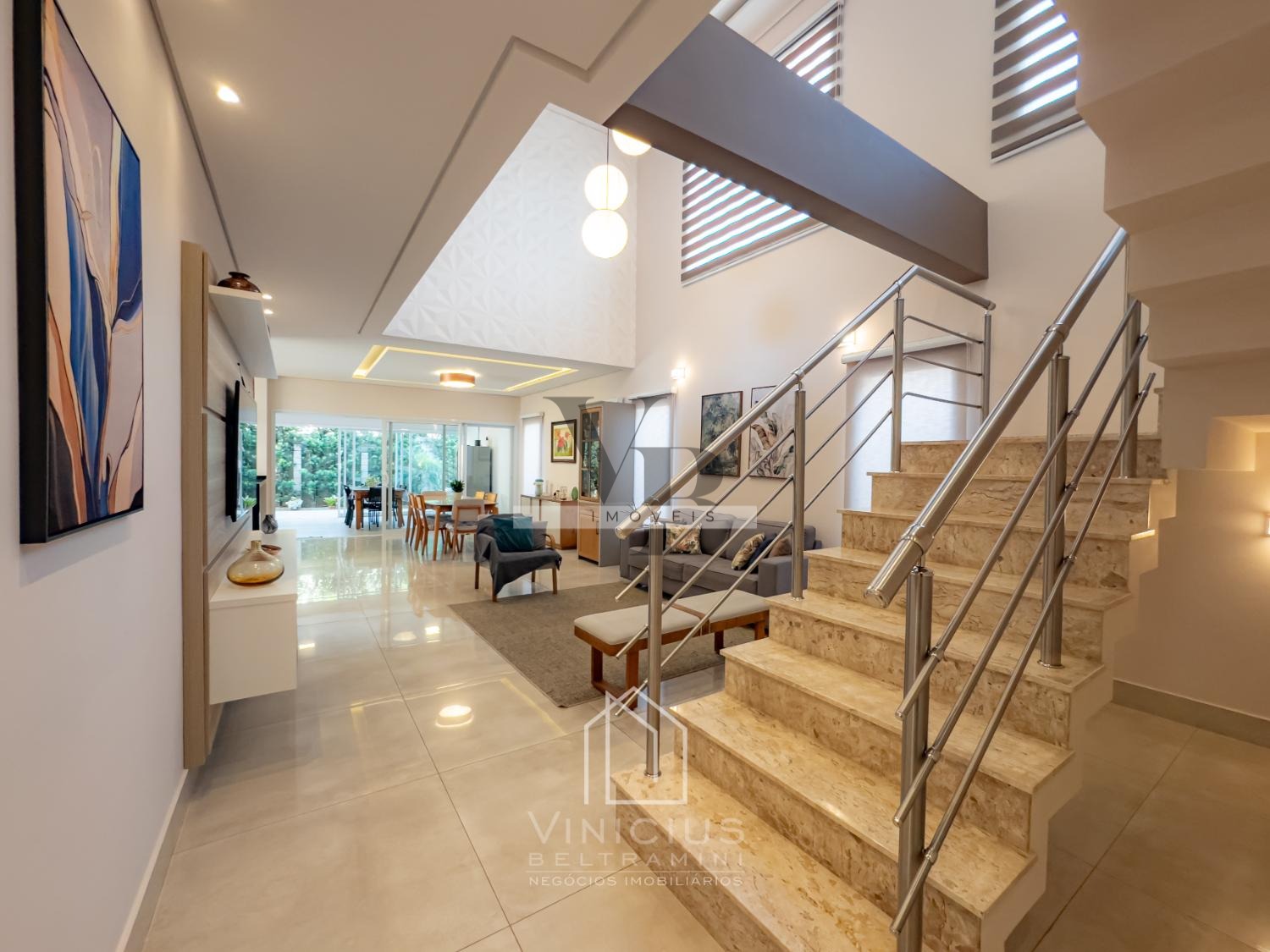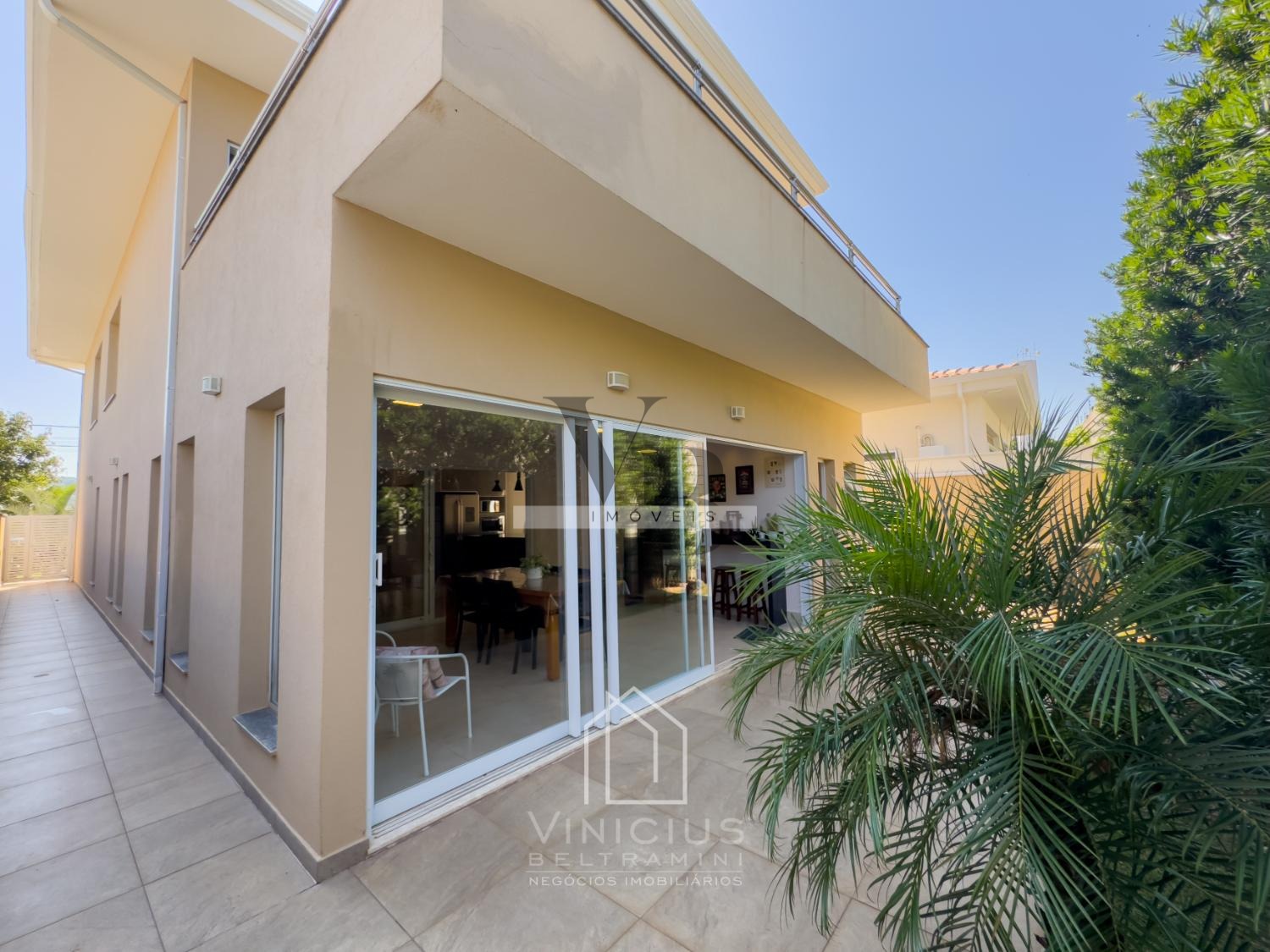 No pavimento térreo, o imóvel conta com pé-direito duplo e amplo living integrado, proporcionando ambientes espaçosos e iluminados. Possui lavabo, cozinha americana equipada com ilha, cooktop, forno e coifa, além de um espaço gourmet envidraçado, integrado à cozinha e com banheiro de apoio. Dispõe ainda de despensa, lavanderia, quintal com paisagismo e acesso lateral independente. Garagem com capacidade para 6 veículos, sendo 4 vagas cobertas e 2 descobertas.