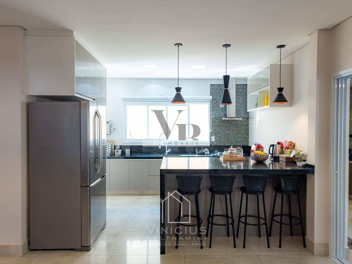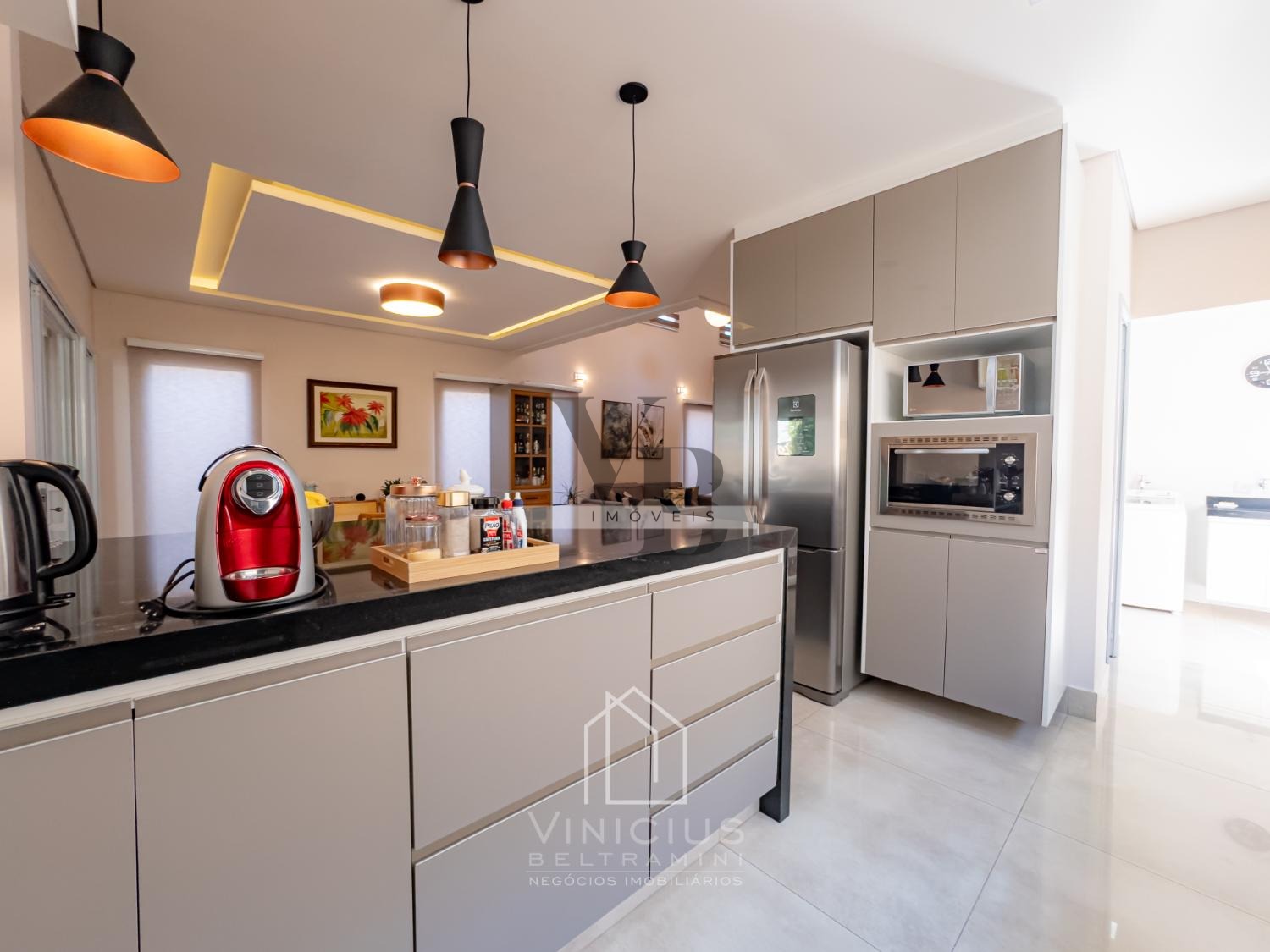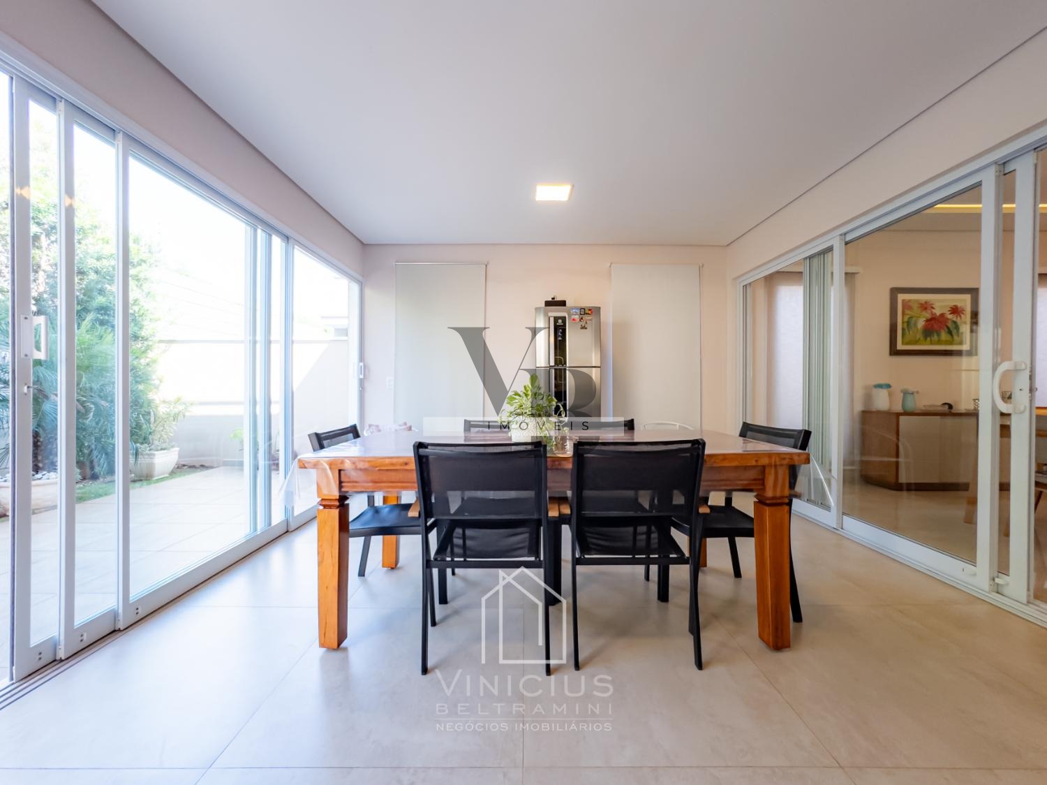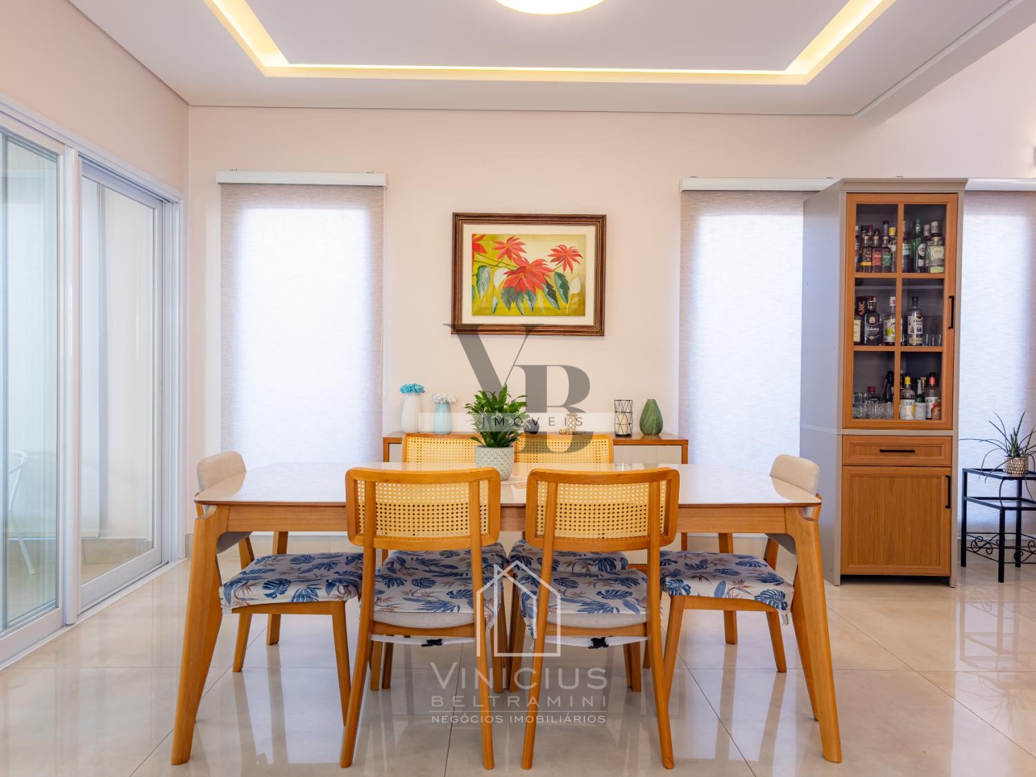No pavimento térreo, o imóvel conta com pé-direito duplo e amplo living integrado, proporcionando ambientes espaçosos e iluminados. Possui lavabo, cozinha americana equipada com ilha, cooktop, forno e coifa, além de um espaço gourmet envidraçado, integrado à cozinha e com banheiro de apoio. Dispõe ainda de despensa, lavanderia, quintal com paisagismo e acesso lateral independente. Garagem com capacidade para 6 veículos, sendo 4 vagas cobertas e 2 descobertas.