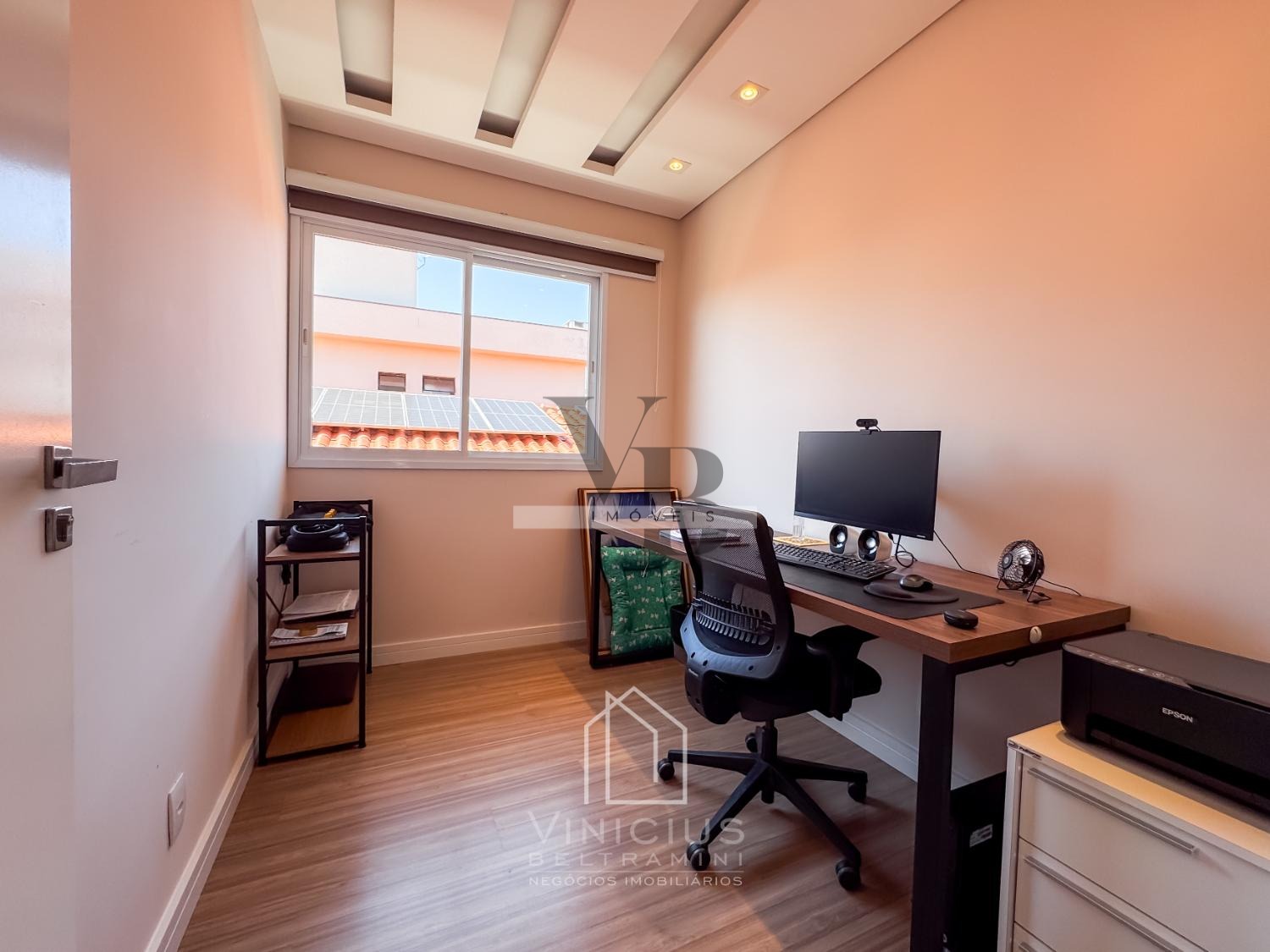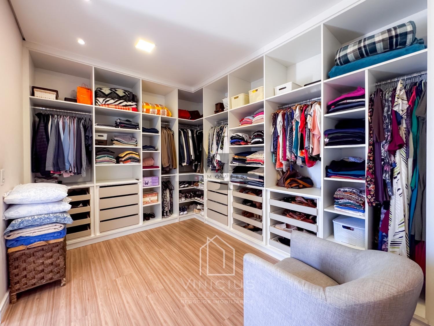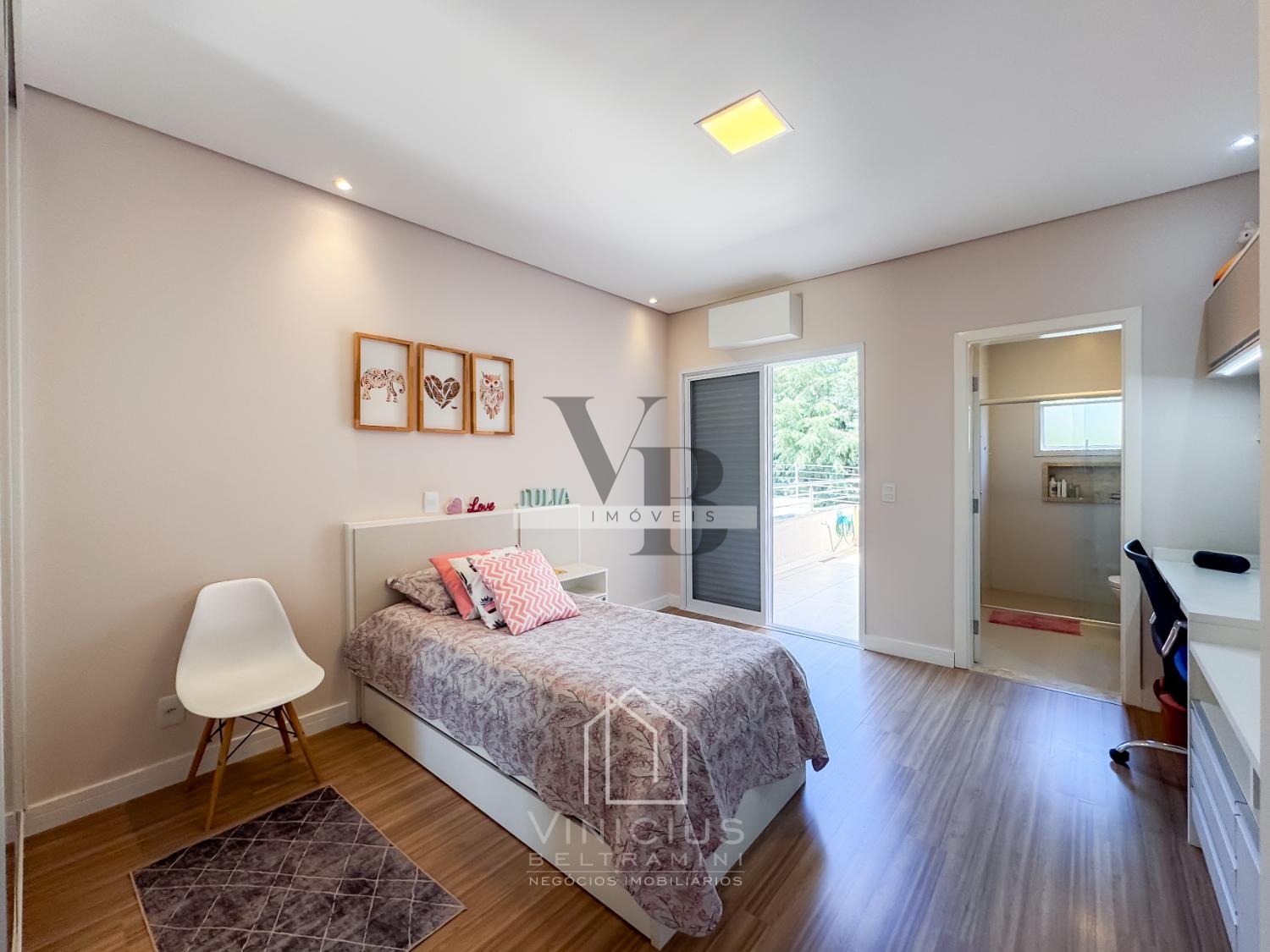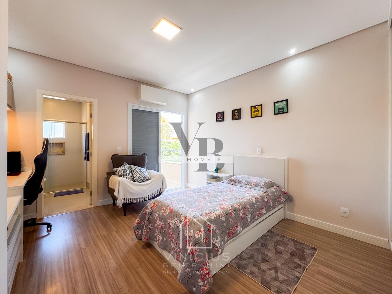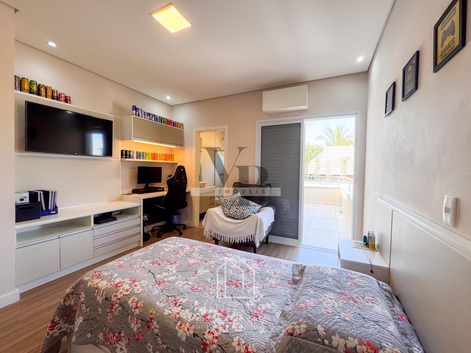 No pavimento superior, há um confortável home theater, escritório, roupeiro e 3 suítes, sendo uma suíte máster com closet e varanda, além de duas suítes também com varanda. O imóvel é rico em móveis planejados e já possui infraestrutura preparada para instalação de ar-condicionado.