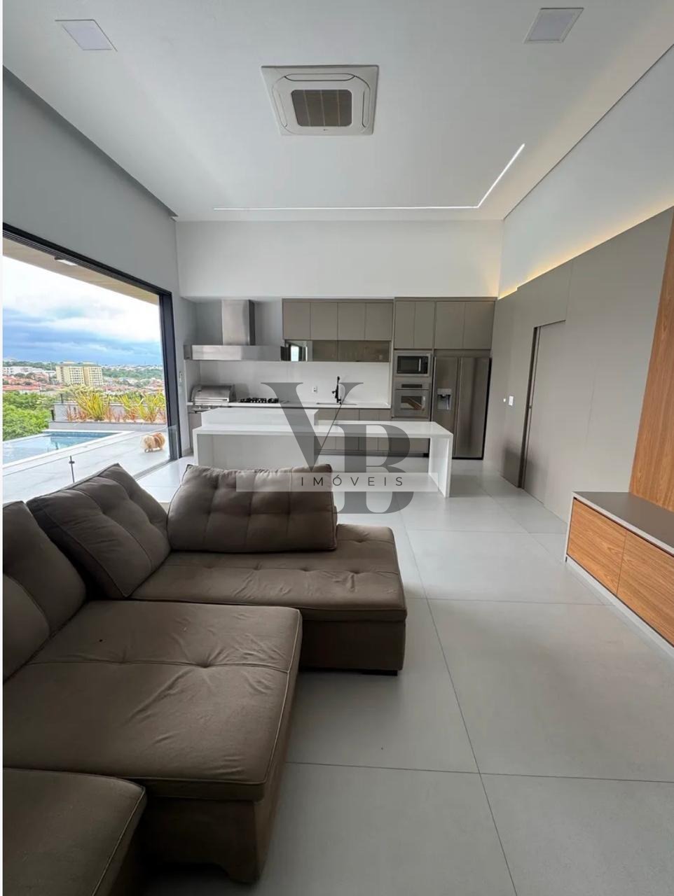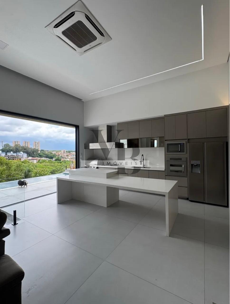 O living possui pé-direito alto e integração total com a cozinha gourmet, equipada com churrasqueira e mesa/bancada em quartzo branco, criando um ambiente ideal para receber e viver momentos especiais.