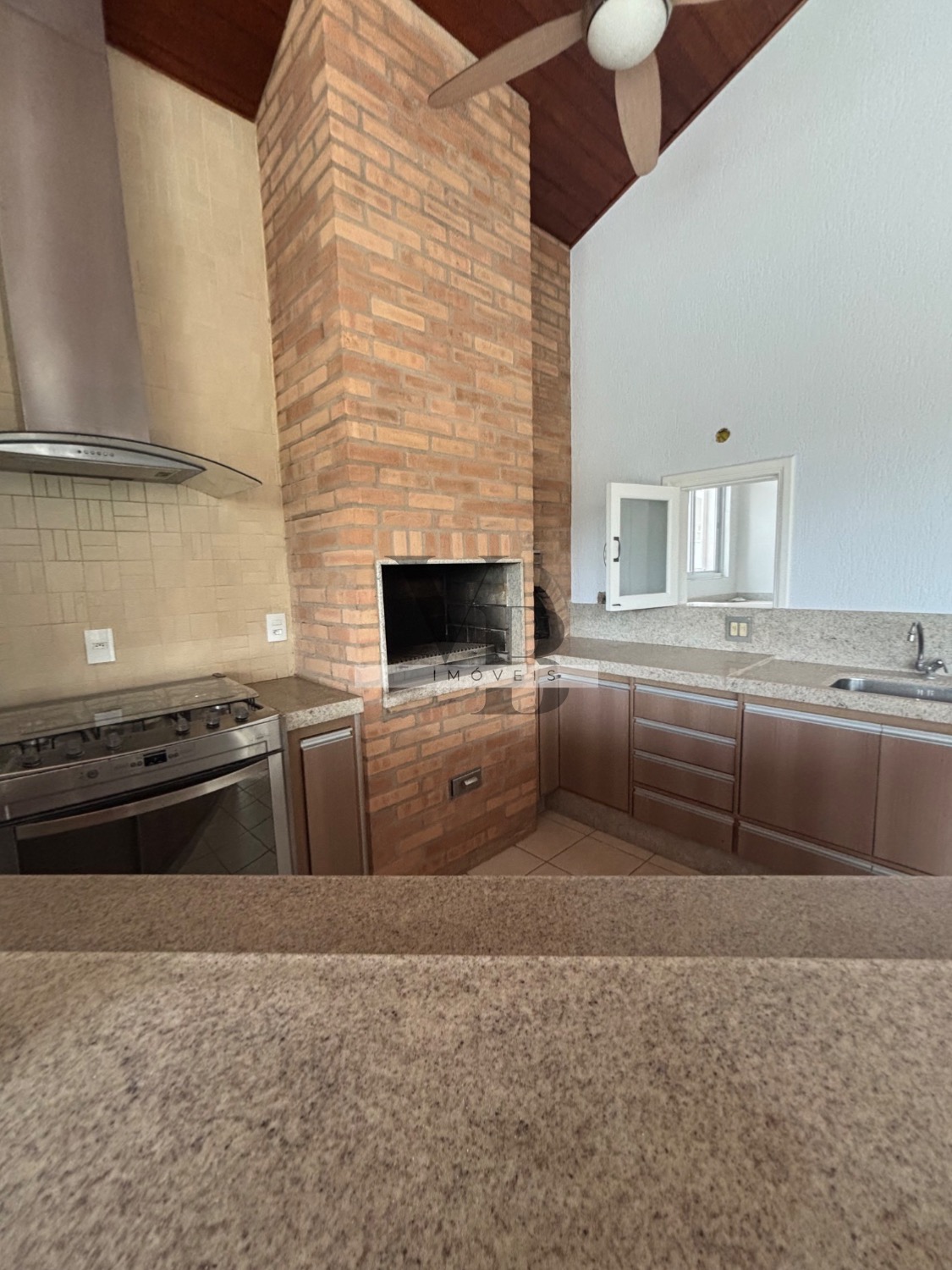 Espaço gourmet completo com churrasqueira, forno de pizza, fogão e balcão de apoio